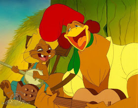Just the same, the film is wildly entertaining and emotionally satisfying. (The moment where Patou begins to chant Chanticleer's name as the freshly struck-down Edmond had been doing, has full emotional charge.) One wishes the film had been a little less rapid, and taken a minute or two to really soak in what's presented to us. Mostly, one wishes the musical numbers would've been better exploited. If the idea is to do a play on Elvis movies of the 50's and 60's, ROCK-A-DOODLE overlooks completely that the whole point of those films was to showcase Elvis singing. Glen Campbell provides some very evocative tunes (aided no end by vocal accompaniment by the Jordanaires), but we hear little of it through all the voice overs. The one song we do hear uninterrupted, "Sun Do Shine" is relentlessly catchy.